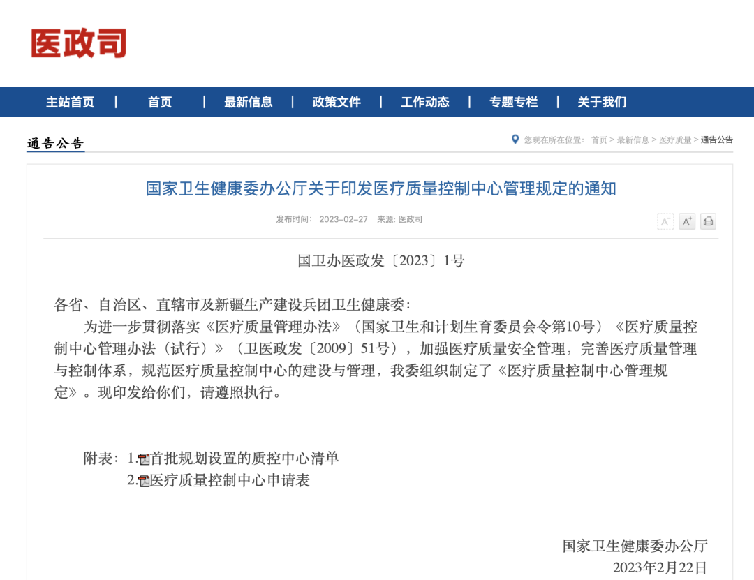 《医疗质量控制中心管理规定》发布,首批质控中心包括3大类6个领域60个具体方向